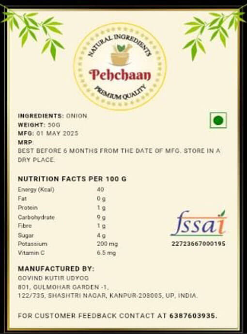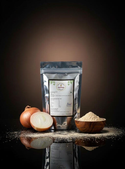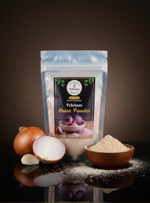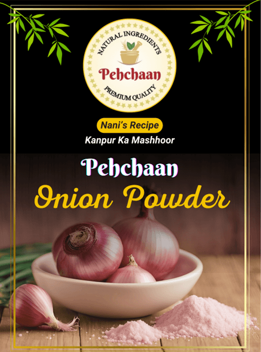 Onion Powder aslo known as Pyaaz Powder/Kanda Powder/Dungali Powder/Peyaaj Guro/Vengaya Podi/Ullipaya Podi/Eerulli Pudi/Piyaaj ko Powder. Pehchaan’s Onion Powder is made from premium Indian onions that are fully dehydrated and ground into a fine, white powder. It preserves the sweet-spicy flavor and aroma of fresh onion, making it an easy way to add depth to curries, gravies, chutneys, and seasoning mixes. The powder dissolves readily in liquids and holds up well to cooking, imparting natural onion taste without the need to chop fresh onions. Rich in vitamin C, fiber, and flavonoids (like quercetin), onion powder also contributes nutrients and antioxidants. Our product contains no artificial additives, just pure onion content. The mild yellow white powder is an all purpose kitchen staple.