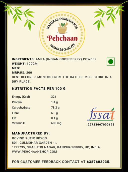 Amla Powder aslo known as Awala Powder/Aamla Powder/Amloki Guro/Nellikai Podi/Usirikaya Podi/Nellikayi Pudi/Amla ko Powder. Amla Powder is made from dried Indian gooseberries Phyllanthus emblica, which are sun dried and finely milled into a tangy, light-brown powder. Pehchaan’s amla is organically sourced and retains the tart, citrusy flavor of the fruit. Amla is exceptionally rich in natural vitamin C and antioxidants, making it a popular ingredient in health tonics, juices, and smoothies. It can be mixed into juices, smoothies, or teas, or added to spice blends and chutneys for a boost of tang and nutrients. In Ayurveda, Amla is revered as a rasayana (rejuvenating) that balances all three doshas and promotes overall vitality.